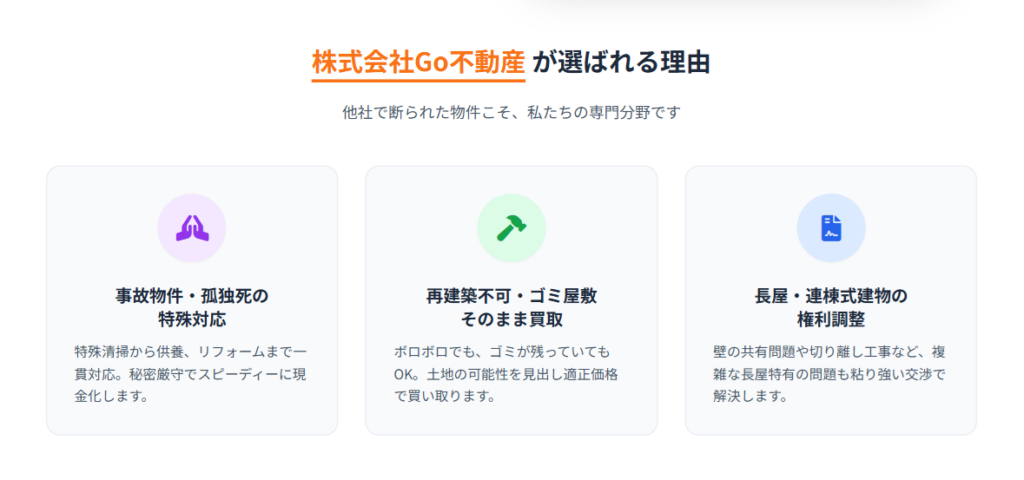 株式会社Go不動産は、他社で断られた物件など、訳あり不動産を中心に不動産再生に取り組んでいます。