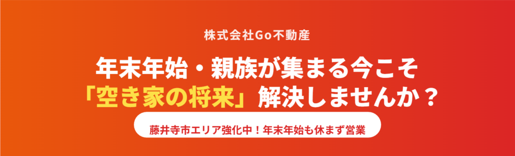 藤井寺市の皆様、そして関西エリアにお住まいの皆様、本年も株式会社Go不動産をご愛顧いただき誠にありがとうございました。