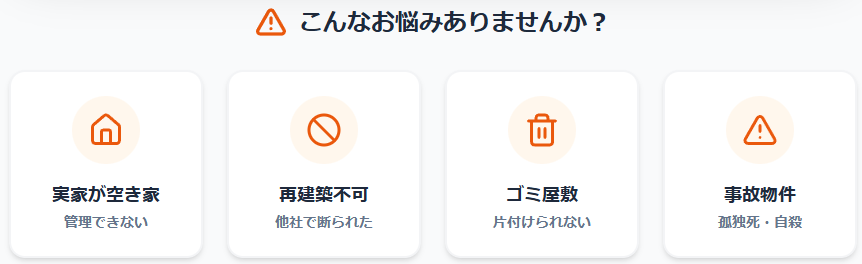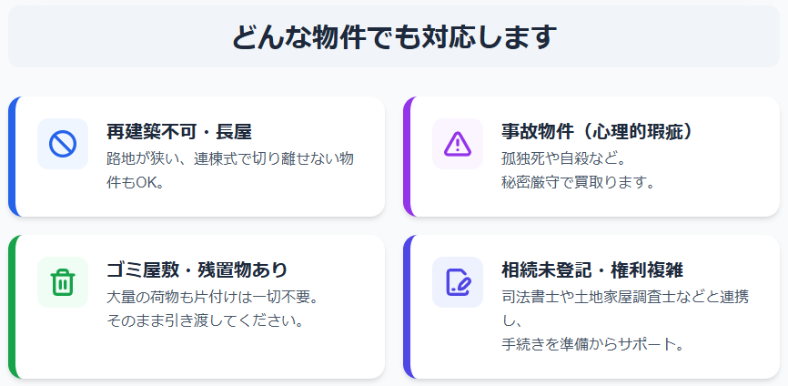 放置された空き家、長屋、連棟住宅 雨漏りや老朽化が進んだボロボロの家 再建築不可物件、立ち退き案件 孤独死・自殺などのあった事故物件 ゴミ屋敷、荷物が残ったままの相続物件