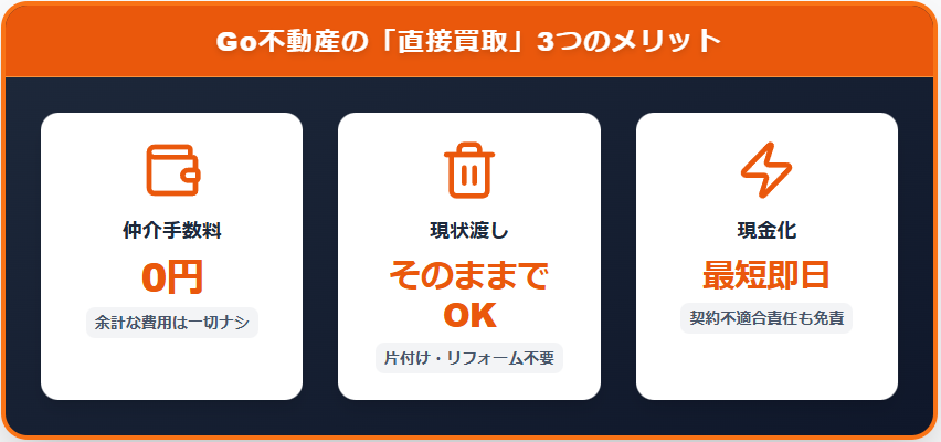 - 仲介手数料が無料 弊社が直接買い取るため、仲介手数料は一切かかりません。
