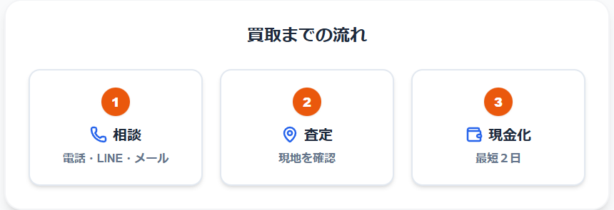 築古物件でも安心してお取引いただけます。 - 最短即日のスピード査定 お急ぎの事情がある場合でも、迅速に査定・現金化が可能です。