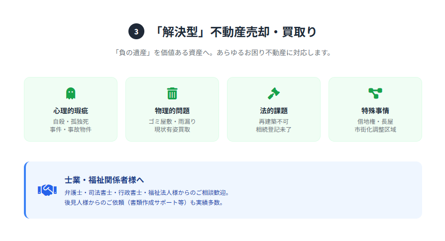 私たちは、一般的な不動産会社が敬遠しがちな、複雑な事情を抱えた物件の取り扱いを得意としています。