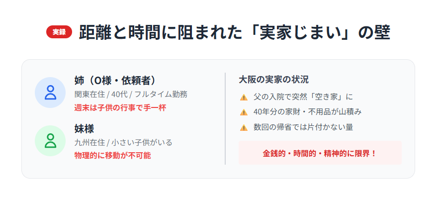 今回は、関東と九州にお住まいのO様姉妹が、大阪にあるご実家の売却問題を「まるごと買取パック」でスマートに解決された実例をご紹介します。