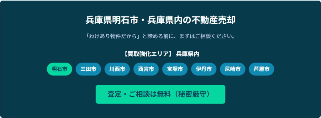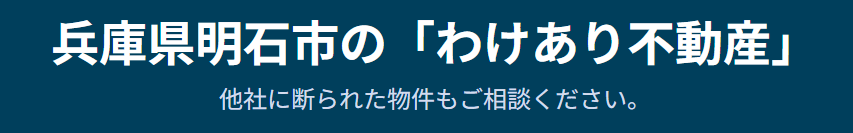 兵庫県明石市をはじめ、上記強化エリアで 「空き家」や「相続物件」の売却 「事故物件(孤独死・自殺)」の買取り 「ゴミ屋敷」状態の家の売却 「長屋」や「連棟」、「再建築不可」物件の売却など、 あらゆる不動産のお悩みに対応いたします。