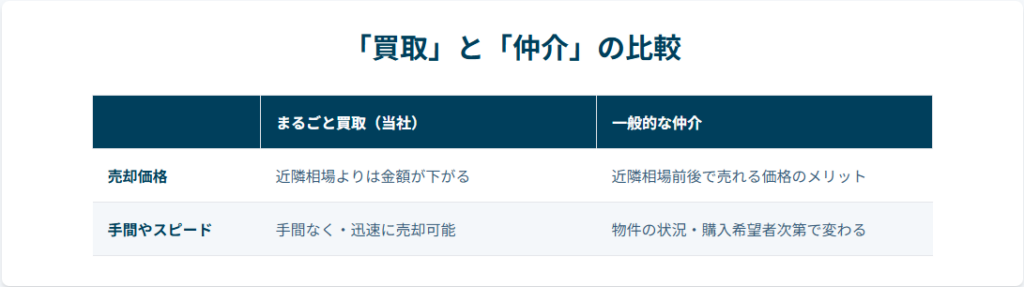 「まるごと買取パック」は、一般的な「仲介」(不動産会社が買い手を探す)とは異なり、私たち株式会社Go不動産がお客様から直接、物件を買い取るサービスです。