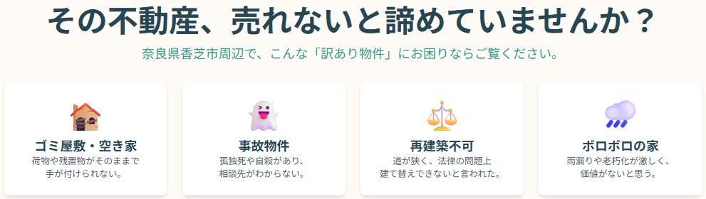 奈良県香芝市で、「空き家」「再建築不可」「事故物件(自殺・孤独死)」「ゴミ屋敷」「ボロボロの家」など、訳あり物件の売却・買取りにお困りなら、どんなことでもお気軽にご相談ください。