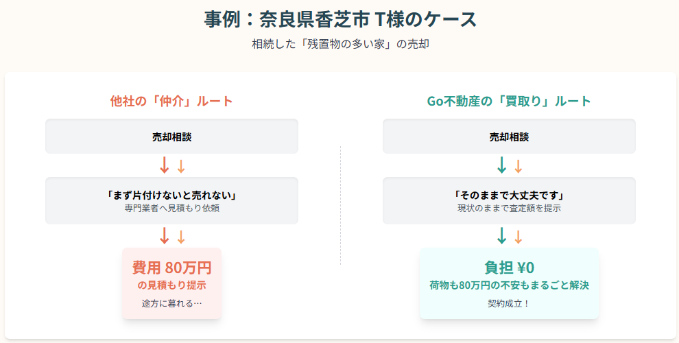 ご自身で片付ける時間も気力も持てず、まさにどこから手を付けていいか分からない状態でした。その後、奈良県内のいくつかの不動産会社に売却(仲介)の相談をしましたが、