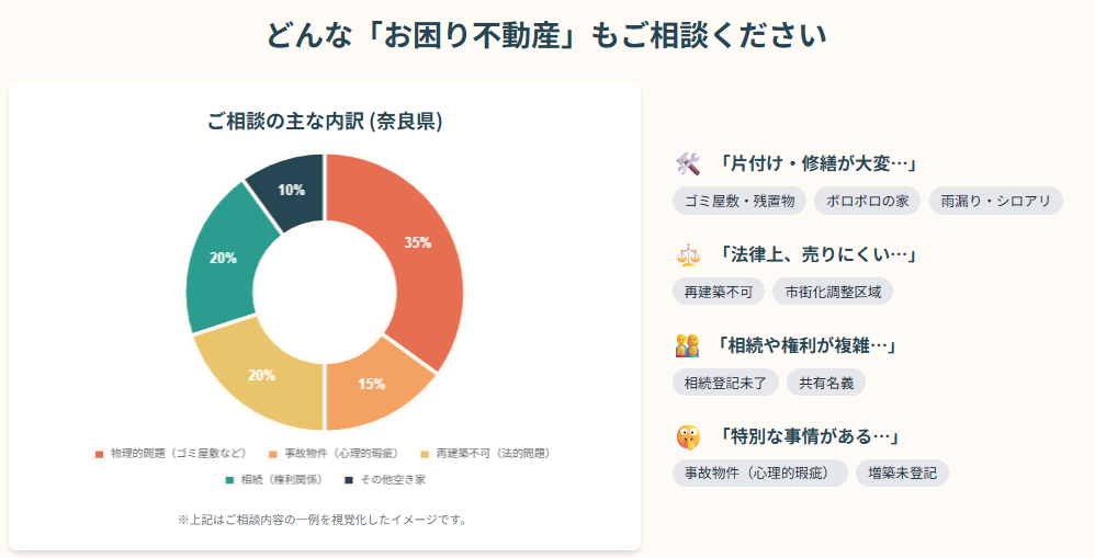 当社の「まるごと買取り」は、奈良県香芝市をはじめ奈良県内で、以下のような物件やご事情を抱えたお客様にこそ、ご活用いただきたいサービスです。
