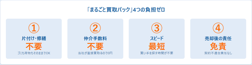しかし、当社の「まるごと買取パック」なら、お客様が片付けや清掃、修繕をする必要は一切ありません。