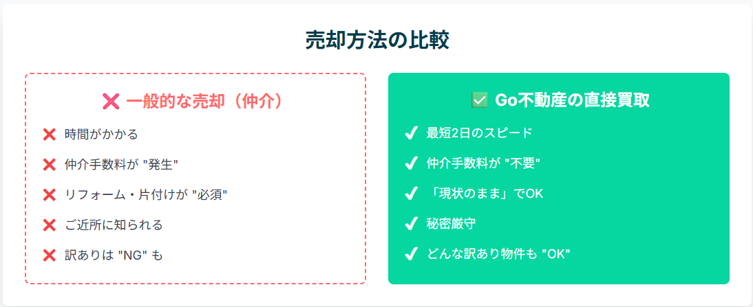 私たちGo不動産は、そのような物件を「仲介」するのではなく、【当社が直接、お客様から買い取る】という方法(=不動産買取)を専門としています。