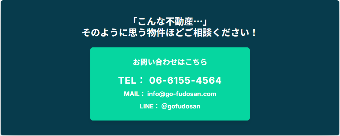 大阪で、ご相続された物件や、管理にお困りの空き家、あるいは長屋や事故物件といった、様々な事情で売却が難しい不動産のことでお悩みなら、ぜひ一度Go不動産の無料相談・無料出張訪問査定をご活用ください。